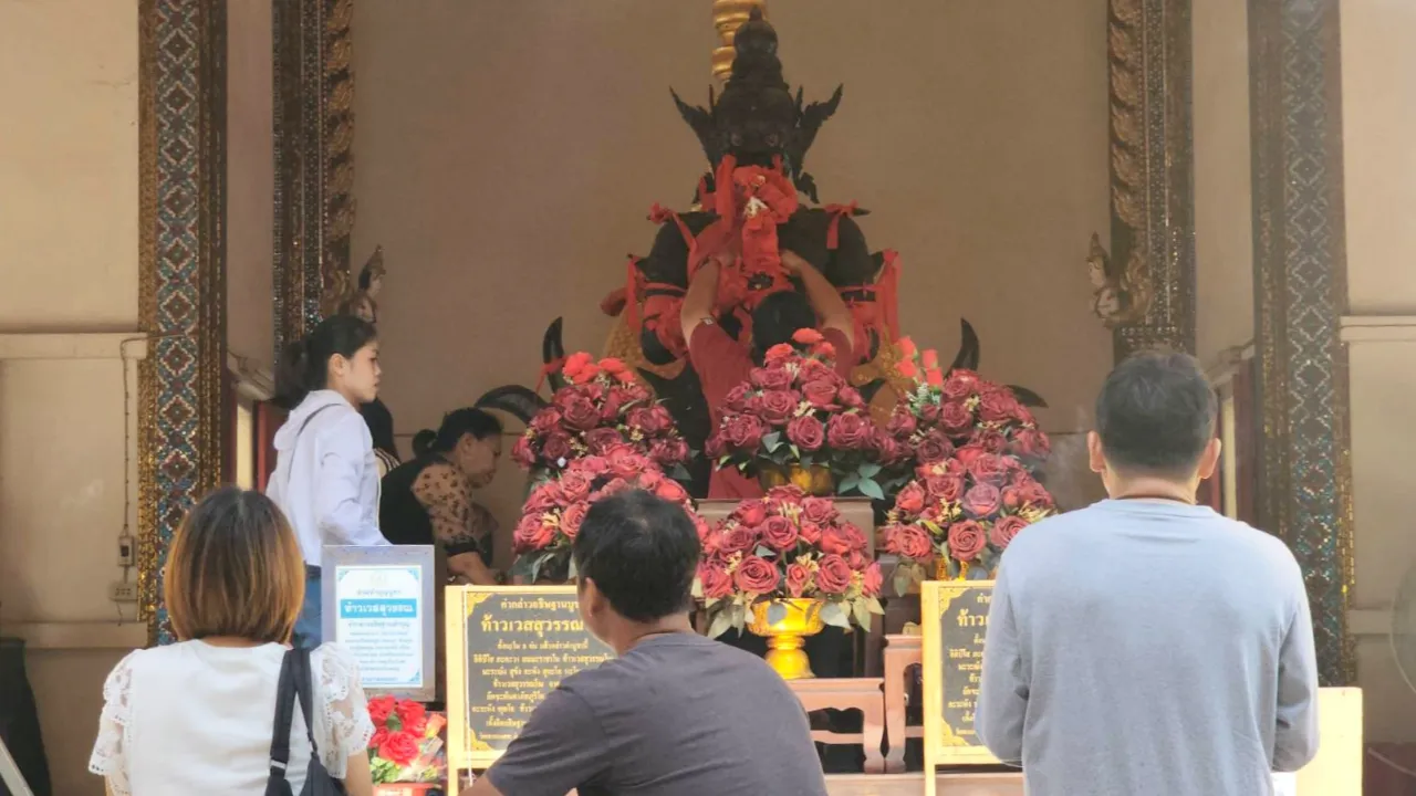 โดยได้บอกกล่าวขอโชคลาภ และยังได้บนบานศาลกล่าวไว้ด้วย ว่าหากได้โชคถูกรางวัลใหญ่จะนำข้าวสารพร้อมน้ำดื่มชุดใหญ่มาถวายแก้บนหวังว่าท่านท้าวเวสสุวรรณ จะให้โชคตามคำอธิษฐานโดยเลือกจุดธูปแดง เพราะเกิดวันอาทิตย์ ปรากฏได้หมายเลข 2 9 4 จากนั้นเมื่อได้เลขธูปแล้วก็เดินไปหาซื้อลอตเตอรี่ตามแผงที่ตั้งอยู่รอบวัดแล้วเดินทางกลับ.